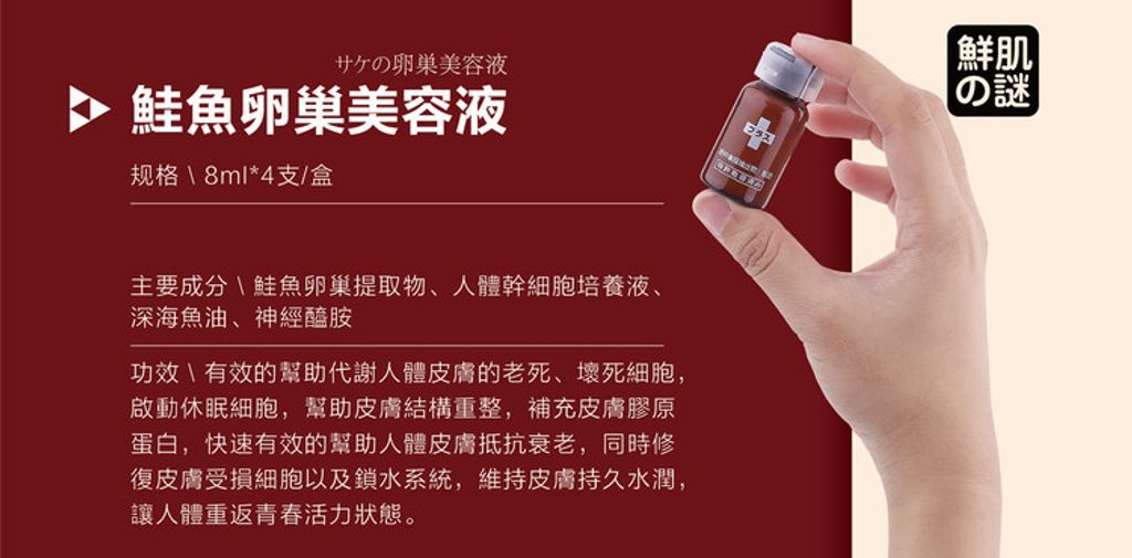 鮭魚卵巢提取物美容液內含魚卵萃取物,聚集了眾多人體皮膚生長所需的營養成分,接觸皮膚有效成分瞬間直達真皮層。皮膚是人體代謝最旺盛的器官,需要多種營養成分來幫助皮膚代謝。