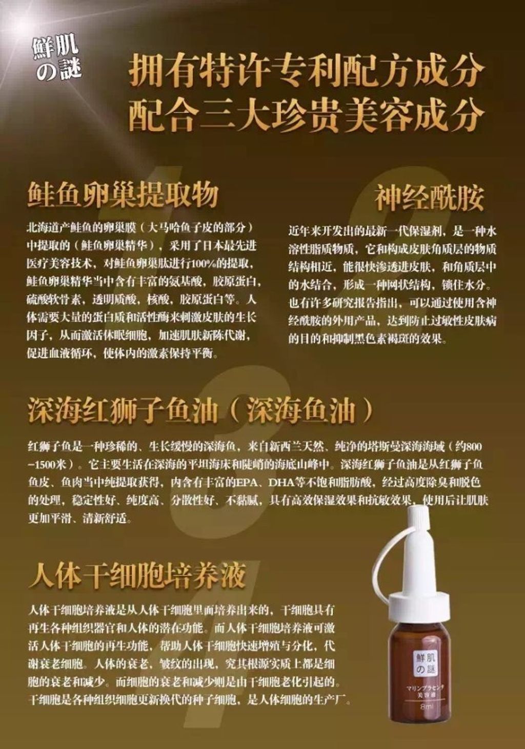 因此鮭魚卵巢提取物美容液可以有效的幫助代謝人體皮膚的老死、壞死細胞,激活休眠細胞,幫助皮膚結構重整,大量補充皮膚膠原蛋白和水分,維持皮膚持久水潤,有效的幫助人體皮膚抵抗衰老,讓人體重返青春活力狀態,從人體根本達到真正抗衰效果,保持長久青春。